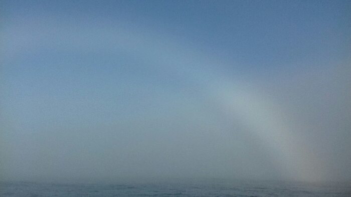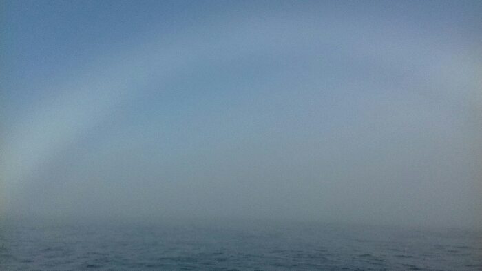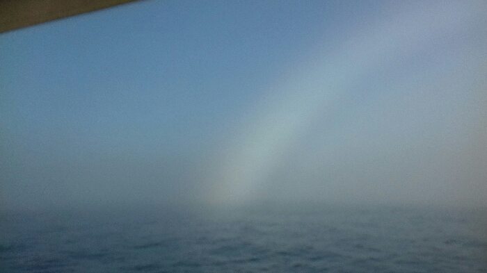 A white 'lightbow' in the fog nearby - an arc of white light off to port caused by the low sun shining onto the fog droplets/moisture from the other (starboard) side - a 'first' for me!