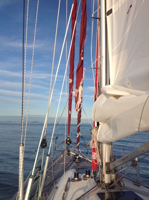 Thurs 7.30 p.m. Dark. Wind keeps varying - mainly ~10 kt with occasional gusts to ~15kt. Full genoa and reefed mainsail are working well with help from motor to give 6kt SOG. Seas still 2-3 m from S, so they're knocking us about most of the time - have to be careful to hold on well when moving around.
