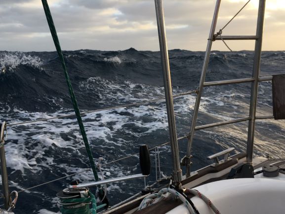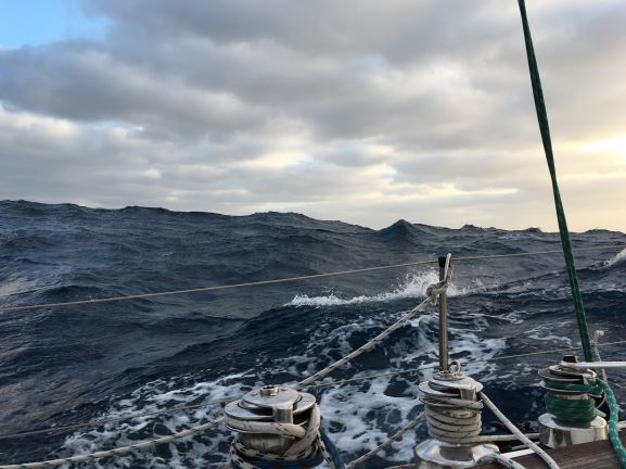 Saturday 8am Grey clouds everywhere with a few tiny blue patches. Wind still up around 25kt - from SSW - and seas still keeping us dancing around, often heeled well over each way rapidly, as a 4m/13ft wave passes under. We're making 5.6kt just N of due E, making good Easting but not too much Northing - don't want to get too far N in the High coming up behind us, to avoid the light headwinds of its Easterlies there.