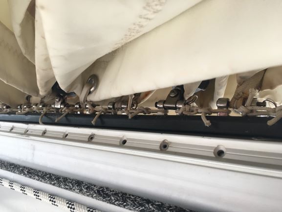 Found another tear by the leech lower down in the sail, while releasing it in order to persuade the sail to move forward so I could get the sail slides into the mast track. I've stuck it on both sides with sail repair tape but need to reinforce that with material - more 'tabling needed (have some Sunbrella I can use) - so won't raise the full main until I've managed to do that . Fortunately it's easy to get to from the cockpit, although the sail need to be released from the boom in order to do so.