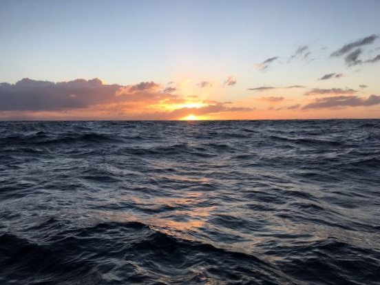 6:30am First light before dawn, increasing rapidly. Seas quite rough and close at every 7 seconds - heeling us over... Surfing briefly at over 8kt but generally making around 6.3kt in SW wind just over 20kt, although might be lessening. Just a few clouds in sky - pleasant morning.
