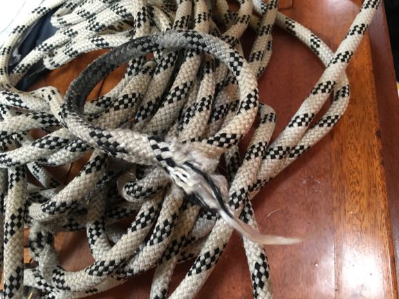 Wondering about using the spinnaker halyard brought aft around the mast - but chafe will be a problem if I do that. Only other available choice is the 2nd genoa halyard.... but I'd prefer to keep that in reserve for the genoa, in case of a problem of failure with the present genoa halyard. Also, the spinnaker halyard is slightly thicker, so should be stronger. Took away the old topping lift from the boom end.