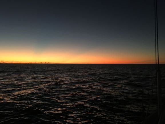 Thursday 3:30am Very dark night - no moon - with pleny of stars and just a little cloud. Drifting W at 0.5kt - so must be slight E wind? Peaceful. Wind generator blades hardly turning so wind under 6-7kt. AIS scfeen showing Huahine to be lying about 95 miles to SE. Papeete, on Tahiti, is about 115 miles due S. Feeling thirsty - water, then back for more sleep... Rocking gently in swell.