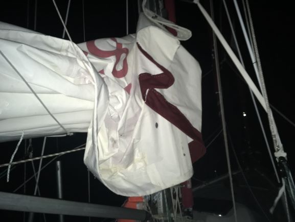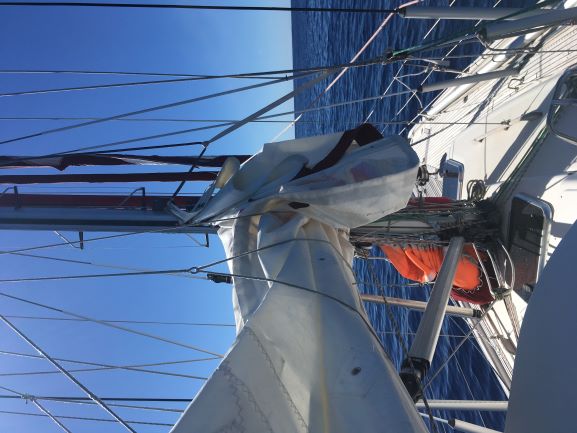 Main has been lowered ready for repair - head of sail is looking rather sorry with several other holes/tears seen - all in need of dealing with and will keep me busy all day, I think.
