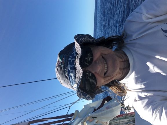 Wednesday 1:30pm LT/Tahiti time (Wed 2330 GMT) Wind 5-6kt from NE - just died away to nothing again... Hot under clear blue sky. Protected by long cotton trousers, cotton socks, long-sleeved top plus floppy hat, sunscreen and sunglasses - everything is covered except for lower part of my face and my hands - and back of those have sunscreen also!