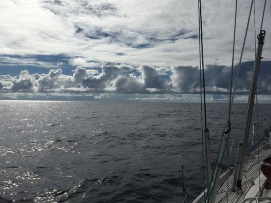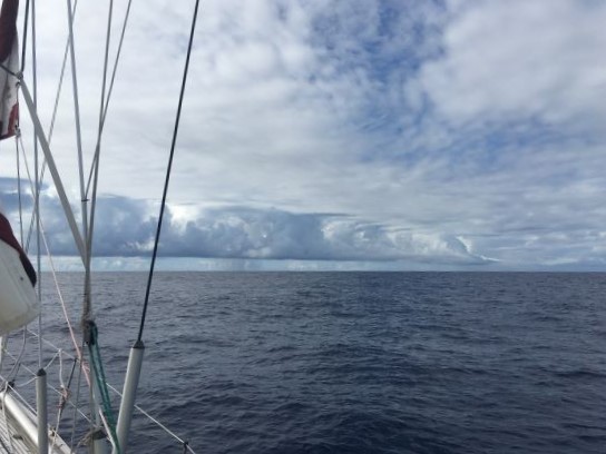 COMMENT: Drifting again after sailing NW under genoa o'night, in wind after rain. Convergence line of cloud just ahead.