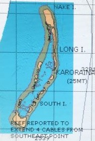 We're 600 miles due W now of Hiva Oa, in the Marquesas, and passed within 50 miles E of the 6 mile long atoll of Karoraina, part of the Kiribati group of islands, soon after midnight. I hear it is uninhabited and a wild life refuge, full of seabirds. There are only a few very small islands on its coral reef and its maximum height is only 25m above sea level.