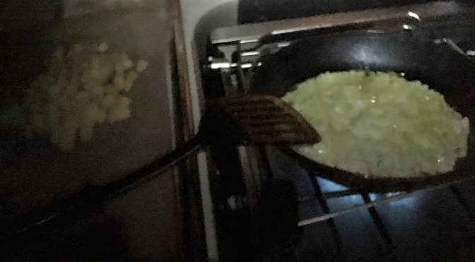 Preparing food... onion and potato omelette. I missed starting it well before sunset and the Pacific Seafarers Net, which is very soon after, so I ended up cooking by headlamp!