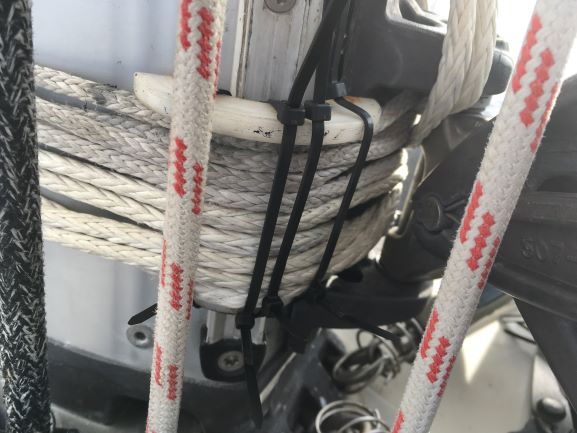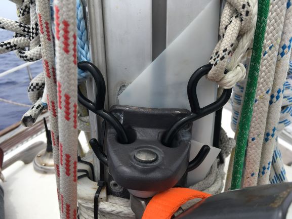 Sunday 6pm Very pleasant sunshine most of the afternoon, but with increasing grey cloud towards the evening, endig up as totally grey skies as darkness was falling. Several useful things done this afternoon, while ambling along at 3-3.5 kt in little wind but pleasant sunshine. For anti-chafe on the lashing at the rod-kicker base, I used a PTFE item I've been storing, waiting for the day it would prove useful - its day came today! It's doing a good job, keeping the lashing off the trysail track as it passes over it on its way around the mast. Cable ties make sure the lashing won't slip off the PTFE.