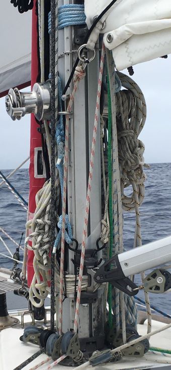 I also wanted to raise the foot and used the winches on either side of the mast to help do that - made it much easier to raise into position initially than it might otherwise have been, using the two sturdy hooks that I found yesterday to attach to the kicker fitting. Once the kicker had been raised as far as possible (almost back to its original position) I was able to tie Spectra line around the mast winch bases from the same two hooks on the rod-kicker base fitting to secure it in position. I'm pleased I found a way to raise the kicker foot - it was far too low before and was too often resting on the bimini metalwork - using it as a 'gallows' it was never built for. I hope my efforts all work out as intended.