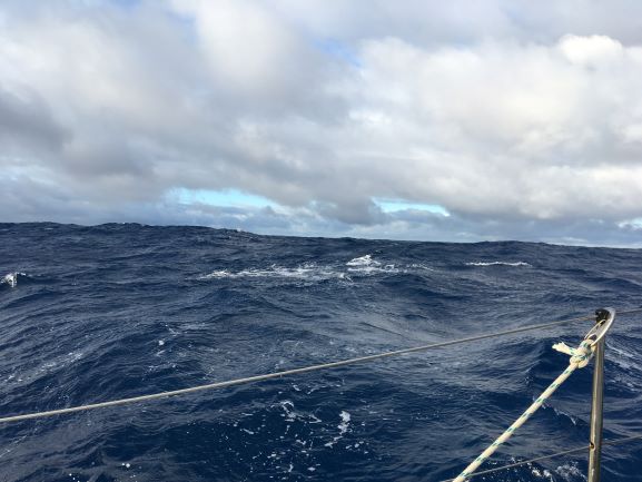 Spoke to Susanne on 'Nehaj' after the Pacific Seafarers' Net - she's lying to her Jordan Series Drogue, staying safe in 50kt winds. She'd deployed it five hours earlier and is likely to lie to it for a day in all. Good to be safe in big seas and strong wind....