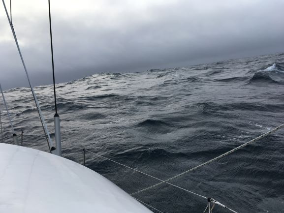 Thursday 3:30pm CST Total overcast again. Hove to still. Wind has been building but gusting up and down for most of the day - now to 29kt from NW. Waves are fairly big and the occasional one bangs into us with a sudden noise.