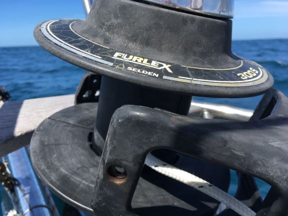 Midday Boat sailing gently at 4.4 kt in NW wind. Busy working on Genoa furler in bow, while sunny and light wind with small swell. All in bits, at present, about to try to fix end of line in place and then wrap the line around the drum, ready for sail to be hoisted at some point.