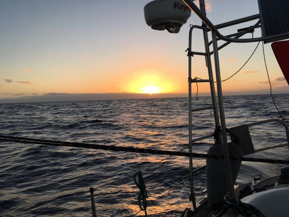 Monday morning dawned grey with cloud everywhere. Wind N-NNW 10kt which became ~6 kt apparent since we're headed downwind. Definitely time to pole out the genoa which had been sounding very unhappy for a time and try to head more directly downwind and hence more S. Took a time to remind myself of the leads and car position needed but finally was able to take the genoa over to port on the pole - a nice stable arrangment for downwind sailing.