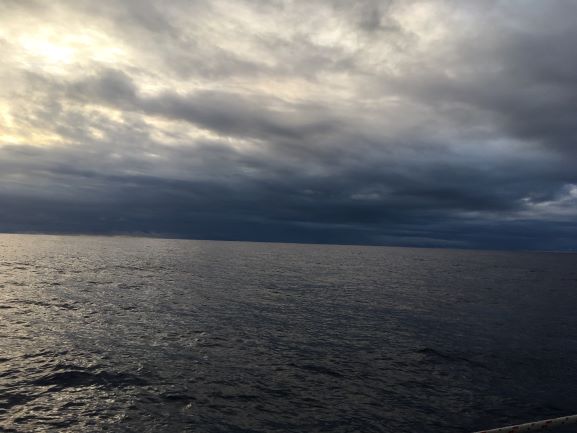 7.30pm Getting dark, with grey rainclouds all around - giving us some wind: 9 kt from ESE. We're making 3.4kt. Most of the afternoon, we were making less than 1kt!