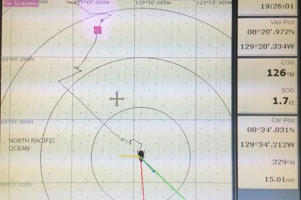 1200 PDT - end of Day26. We made only 32 n.ml.(DMG) over the 24 hr period since yesterday's noon position ... Wind has backed to W-WSW from WNW - no wonder our course is wiggly - no, I've NOT been at the rum!!