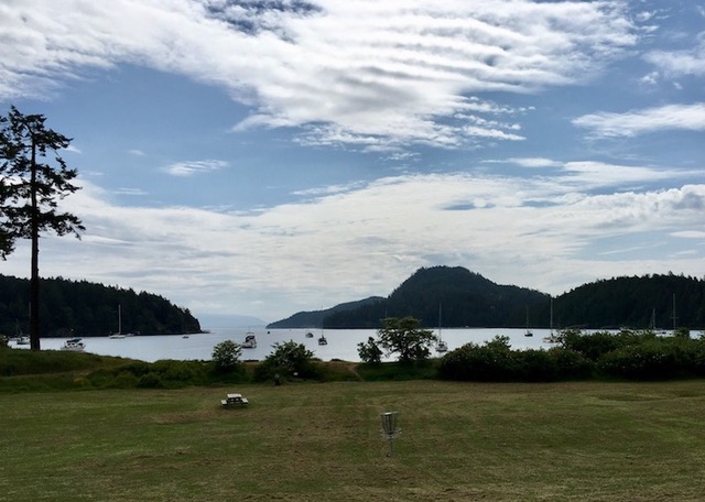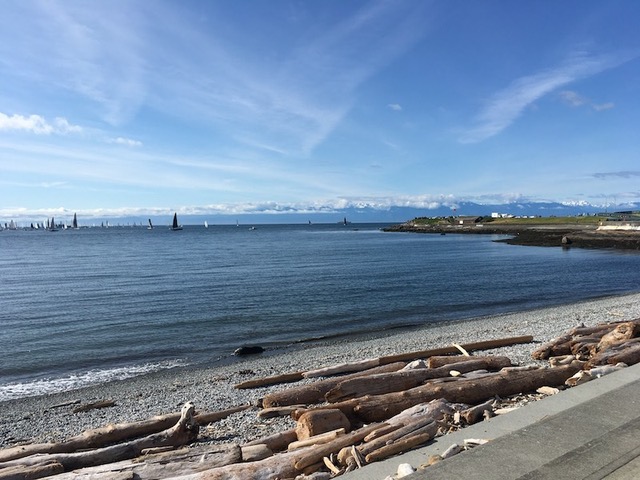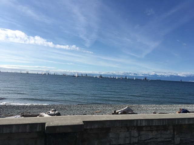 Soon after that, my faithful fold-up Brompton bike was returned to me (the ex-Commodore Gordon and wife Maralyn had been storing it for me with a lot of other gear!) so I've been able to bike around - one time to Oak Bay for a sunny Saturday morning Alliance Francaise get-together to practise my French. Then, last weekend, I biked (TG for Google Maps!) to Clover Point for the start of the Swiftsure Race. Nearly two hundred boats made quite a spectacle as the RCN vessel 'Nanaimo' sounded each start - with a puff of gunfire seen from shore, the sound coming several seconds later - but race flags onshore were clear, with VHF radio contact between the Race Committee on 'Nanaimo' and the shore team filling the void.