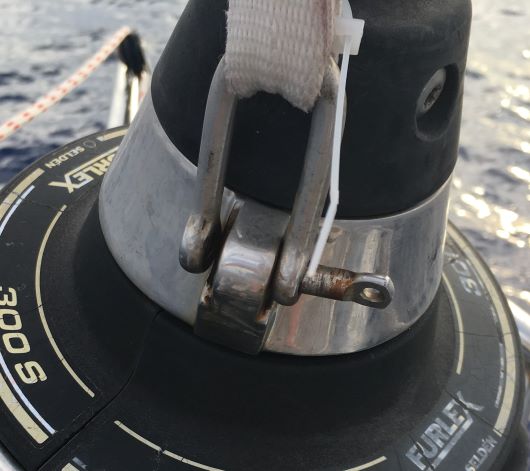 Split pin holding clevis pin in place below Furlex drum - not secured & trying its best to come out. Saw to problem using flat screwdriver and pliers.