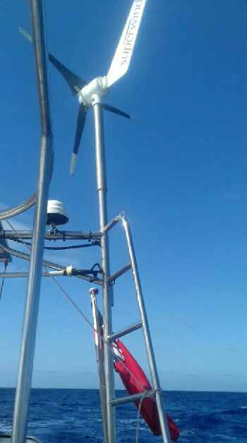 Photo shows light wind effects - drooping ensign and wind generator blades hardly spinning.