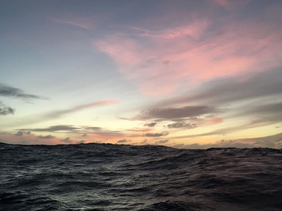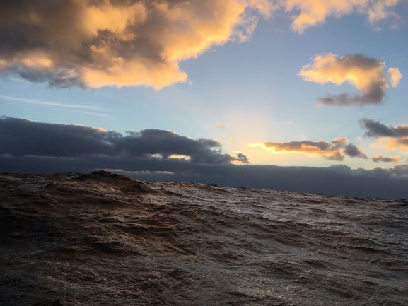 Also, went up on deck to get some fresh air and enjoy the scene nearing sunset. A big swell running still, so big waves still approaching Nereida's stern. A few birds have been around, over the last day or so. Saw an albatross at one point - yellow-nosed or other? Wasn't able to ID it, also other birds, ...smaller - prions possibly.