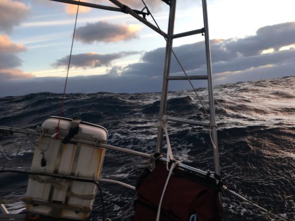 4pm Unfurled some genoa - not much but just enough to boost our speed a bit - to about 5kt, rather than 4kt or less. Rain clouds around so might get strong gusts again... Being very cautious! Seas still very big and tossing us around. Wind from WSW - around 20kt or more on the beam. Sun getting low.