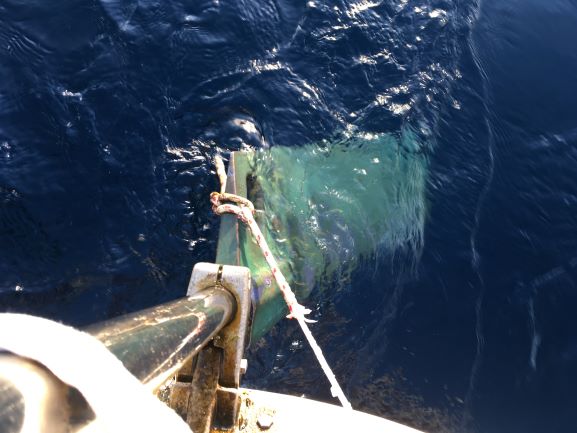 10:50 Problem getting JSD back on board - wind a bit too strong and seas a bit too big and close. Leader line all came in fine but line with cones on is proving difficult - resting for an hour or so and then having another go.... JSD line just jumped under life-raft and threatened to set it off - had to get quickly to stern and move shackle and deployment line fixed to boat up and away from the deck and onto the cradle itself - don't want the liferaft to suddenly inflate unwanted.