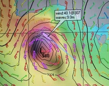 11:30am Just got back down below (no sleep!) after lowering trysail and stowing/tying it down ready for deploying the JSD (Jordan Series Drogue) later today - took a far longer time than expected to secure the sail well and a big swell, moving boat from side to side, made it very difficult.