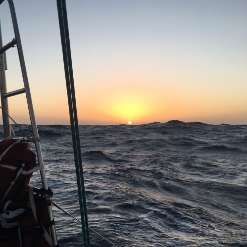 2am Thurs LT (Wed 1900 GMT) Rough going - glad the genoa is furled away... Strong conditions with frequent gusts (one came around midnight) and big seas catching us for a bit of surfing at times... Back to my bunk after posting this... Will be nice when it all calms down later!
