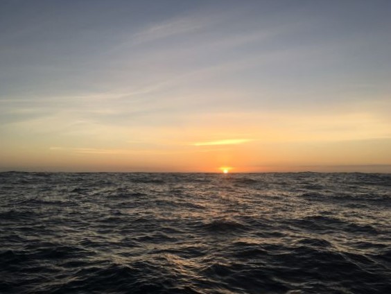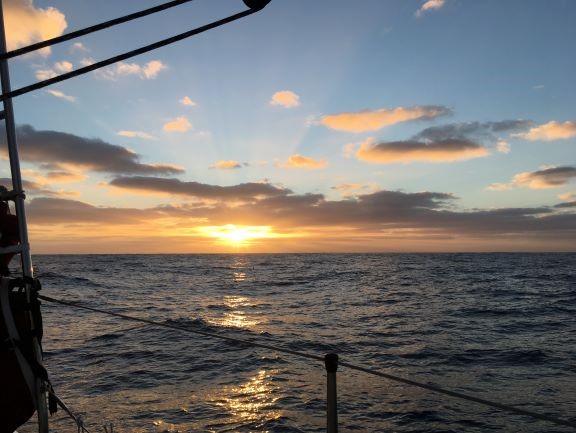 4:30pm A lovely sunny afternoon. Sky is almost clear blue - just a few big clouds on the NE horizon ahead. Sunset not far away - will be a good one, I'm thinking. Making around 6.3 kt still. Unbelievable to think that in just a few hours' time, the wind will be whistling in the rigging and seas will be well up again, with rough conditions.