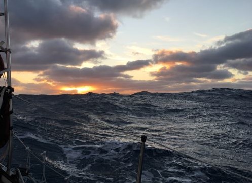 Sunday 11:30pm Speed has increased slightly - seeing 3.5kt instead of 2.5kt - maybe wind is filling in, finally...? Supposed to get up to NW 14kt about now - beam reach - and stay that way for a time, before increasing further early on Tuesday. Moon rose a short while ago - waning now - half-moon. Swell has increased slightly - we're bouncing about more than earlier. Later: Clearly quite a strong S-flowing current here - having to steer NE, upwind more, in order to make our ENE course - must be slowing us down. Making around 3.2 kt - rather pounding into the waves - uncomfortable motion. Moon is bright enough to give good light on deck - throwing a broad path of silver light across the sea towards us from between broken cloud. Monday 1am Making 4kt - still having to head more upwind and so still an awkward motion. 6am Much smoother sail, making 6kt but struggling to make close-hauled course to ENE. Grey, cloudy sky with some breaks for sun to shine through - sunrise was a short time ago. Occurred to me that heading upwind more to make close-reach course might not be necessarily due to current but due to imbalance of full genoa against trysail - 'bow steer'? 7:30am Rain shower... helps clean the sticky salt off everything on deck! Grey clouds have moved away. 11am Clear blue sky above - a few clouds on horizon and ahead. Sailing at well over 6kt, ENE towards 38S. Cold Front expected to approach tomorrow night and pass over on Wednesday, with strong wind. Time for breakfast... It's 8am GMT! 12:30pm The cloud ahead spread over soon after - but is well broken, so it's still quite sunny - and feeling warm - 25C. Sea temperature is back up also - to 27C now. We're making 6.5-7kt now - nice to see some decent speed! Seas are up and we're being moved around by them often. One just made us lurch - and my insulated coffee mug went flying from a place that is normally secure - but the mug simply jumped in the air and ended upside down on the cabin sole. Its lid was on, TG, so I grabbed it but have had to make do with a very small cup of coffee.. and a lot of cleaning up... 4pm Bright and sunny still, although lots of (white) clouds around - no threat of rain just now. Wind has slowly died back a bit over the afternoon, although still from WNW, so we're only making around 5kt now on a broad reach. Was nice to have the higher speed earlier. There must be a current at times because we have to head up or down in relation to the wind in order to make our course - I've adjusted Fred umpteen times today, as a result.... I get us nicely settled on course and then something changes (wind shift or some current) so another adjustment is needed not so long after the first. Whereas earlier in the day, we were headed more upwind to make our course, we're now heading slightly more off the wind to make it, implying a current effect - all very changeable and unpredictable. 6:55pm Rim of red sun just slipped down below the horizon - end of sunset at 40S 43.5E under a partly cloudy sky. Wind has dropped further to give SOG of only around 4kt - disappointing after the good speed earlier. Looking ahead, the CF coming through over Tues/Wed is looking as though it might have 25kt winds, possibly gusting higher, for a short time, so that's not looking as bad as had been forecast a few days ago. However, that will be followed by an intense Low arriving Thursday evening into Friday, giving over 30kt winds, gusting higher - that could give rough conditions for a time and the big question is whether or not we can get far enough NE of our present position to avoid the strongest winds and seas - Later - speed has dropped even more - to 2.5-3kt .... Grrr!! 1900GMT (=2200LT) - end of Day 145. We made 116 n.ml. DMG over the 24 hr period, measured in a straight line between the two 1900 GMT positions. Total distance covered from Victoria, B.C., to end of Day 145 (by daily DMGs): 13,508 n.ml. Distances (at 1900GMT): Cape Leeuwin LH (SW Australia): 3342 n.ml. to ENE; SE Cape of Tasmania LH: 4295 n.ml. to ESE; Cape Agulhas LH (S.Africa): 1164 n.ml. to NW; Cape Town Hbr entrance: 1258 n.ml. to NW; Marion Isl: 487 n.ml SSW; Kerguelen Isl: 1196 n.ml. SE; St Paul Isl: 1560 n.ml. E; Halfway point (55 18'E): 533 n.ml. Position & weather report, for 1900 GMT, posted to www.Winlink.org and www.Shiptrak.org (using my US callsign KC2IOV): TIME: 2019/02/25 19:00GMT LATITUDE: 39-56.99S LONGITUDE: 043-39.23E COURSE: 069T SPEED: 3.1kt WIND_SPEED: 8kt WIND_DIR: NW SWELL_DIR: NW SWELL_HT: 2.0m BARO: 1018hPa TREND: 0 AIR_TEMP: 21.0C SEA_TEMP: 24.0C COMMENT: Wind died again this afternoon - back to a very slow walking pace..