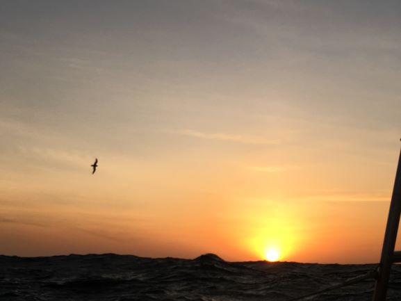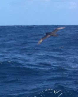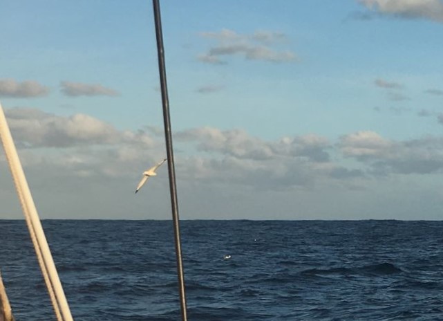 Sunday 6amLT/0300GMT A lovely sunrise here - bright sun just cleared the E horizon. Very thin, high cloud layer of stratus with about 20% solid cloud around on the horizon and a waning half-moon high up - looks so small compared with when it rises or sets! Just finished on radio but a lot of static on frequency to quite a few stations, although E. coast USA and (snowy!) Montreal came in really well - clear signals. Florida and Maine came booming in by 0300Z. Nice to hear Gil, N2GG, from New Mexico - greetings to the rest of the 7155 group! Seas down around 2m/6ft but wind also very light overnight and now - so speed right down to 2.5kt most of the time...very slow... Hoping for more wind later today - back to bunk for some more sleep now! 11am Still a painfully slow but sunny day - no change in wind, as yet.... Just creeping along on a beam reach in almost no wind... Time for coffee ...while I think about getting ready for making a big stew again.. and maybe something different for Sunday lunch. 7pm Well, it's been a thoroughly enjoyable, calm, relaxed, quite sunny day, despite thin overcast a lot of the time... The sun showed itself brightly for a time, just before setting behind a low bank of grey cloud. Replenished some galley supplies - best to do so now, before getting into strong weather in a few days' time. Caught up on emails - although I had a problem contacting Cape Town over the day to receive and send my radio emails - fine after sunset, but not before - a sign of getting further away from the S.African coast - nearest point is now roughly East London, about 780 n.ml. away. 8:30pm Had an excellent set of radio contacts with S.Africans - nice to have clear, strong signals coming from Durban down to Cape Town and around to the W. coast beyond. (Couple more photos from Thursday... - white-chinned akbatross and big seas approaching Nereida) 1900GMT (=2200LT) - end of Day 144. We made 60 n.ml. DMG over the 24 hr period, measured in a straight line between the two 1900 GMT positions. Total distance covered from Victoria, B.C., to end of Day 144 (by daily DMGs): 13,392 n.ml. Distances (at 1900GMT): Cape Leeuwin LH (SW Australia): 3431 n.ml. to ENE; SE Cape of Tasmania LH: 4346 n.ml. to ESE; Cape Agulhas LH (S.Africa): 1065 n.ml. to NW; Cape Town Hbr entrance: 1159 n.ml. to NW; Marion Isl: 400 n.ml to SSW; Kerguelen Isl: 1270 n.ml. to SE; St Paul Isl: 1663 n.ml. to E; Halfway point (55 18'E): 635 n.ml. Position & weather report, for 1900 GMT, posted to www.Winlink.org and www.Shiptrak.org (using my US callsign KC2IOV): TIME: 2019/02/24 19:00GMT LATITUDE: 40-38.61S LONGITUDE: 041-16.81E COURSE: 073T SPEED: 2.5kt WIND_SPEED: 8kt WIND_DIR: WNW SWELL_DIR: WNW SWELL_HT: 2.0m BARO: 1012.8hPa TREND: 0 AIR_TEMP: 20.0C SEA_TEMP: 23.0C COMMENT: Very light wind still - speed is less than walking pace! 60ml DMG;