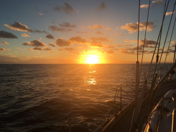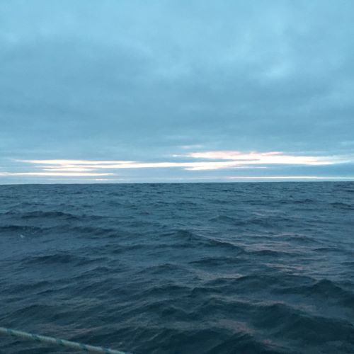 Sunday 7:45am On a beam reach. Wind backed to SSW far more quickly last night than expected and has died quite a lot. Was up on deck twice overnight and each time had to make quite a big adjustment to Fred to get us back on course. Genoa was unfurled completely by 4am (beginning of first light before dawn) but despite that we were back to making only around 3.5-4kt again. Sky is gloomy with a solid grey cloud layer and the air is feeling very moist. Air temperature is 17C and everything I touch feels decidedly damp - including my bedding. 8:10am: Making just over 5kt now - better!