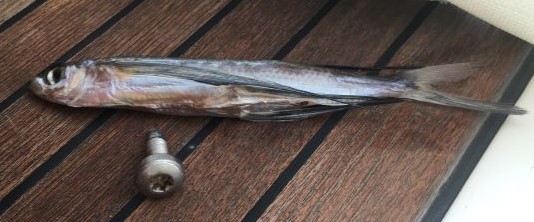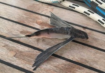 Found a small flying fish dried up on the side deck - must have ended up there when the rough seas of two days ago were washing the decks - had its 'wings' spread still...