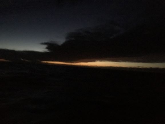 Tuesday 2:30am Passing the north of Gough Island - visible only as a dark high mound - its mountains rise to nearly 3,000m - no lights since uninhabited except for lots of birds and a S.African scientific team of 10 people in their base halfway down the E side of the island. A waning crescent moon, hazy behind thin cloud, throwing very little light over the sea. Light wind, slight swell in the lee of the island, making only 1.2kt.