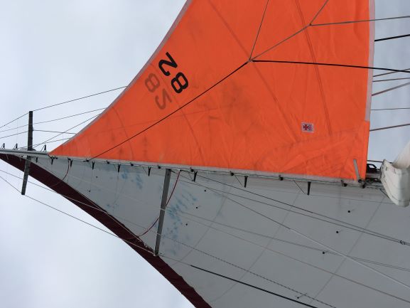Decided to undo lashing etc and try to hoist trysail - gives time to finish off the mainsail repair. More tape needed there (at right angles to edge) and then some stitching, maybe of fabric over the area around the leech and onto the sail body on both sides ('tabling?).