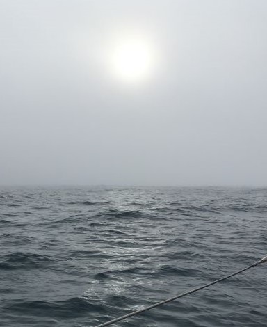 Had hoped we might clear the island but it was too dangerous to continue that way - wind not strong enough to give us a good speed to make it safely. Want to get S if possible to avoid the unfavourable winds above the centre of the High we're in now. Possibly, once further from the island, we can tack around to get S. Wind is likely to back into E later, making that more of a possibility.