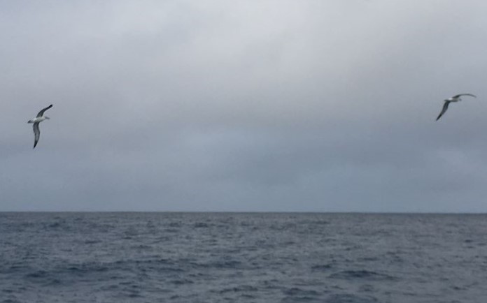Monday 7:30pm Sunset a short while ago but grey clouds on W horizon. Lots of birds flying around near end of day - albatross in distance and a group of white-chinned (spectacled?) petrels close by - couldn't see well enough to determine if they had any white around eyes.