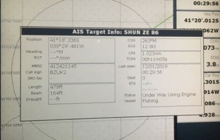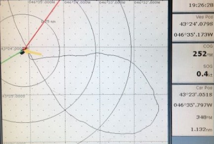 TIME: 2019/01/02 19:00GMT LATITUDE: 46-45.36S LONGITUDE: 049-46.64W COURSE: 030T SPEED: 1.3kt