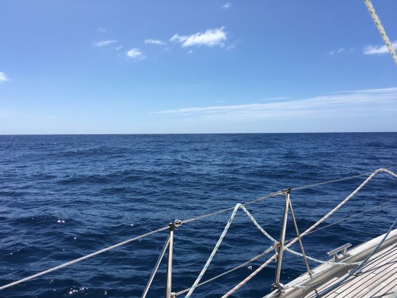 2pm What a beautiful day! As so often happens when the wind and seas calm down, the birds disappear. I visualise them, sitting on the surface in sociable groups somewhere in the vastness of this ocean, chatting to each other...! Under the vivid blue sky, it's become so warm, at 18C/64F, I've had to discard my fleece tops for ahort while - summer has arrived!