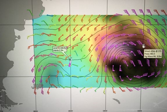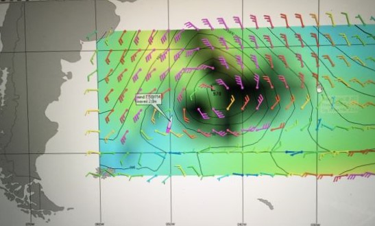 - the direction the frequent Lows always come from. One is expected to develop on our path during Tuesday (8th). I can't get N of it to avoid it so I'm hoping the winds won't be too strong - they're presently expected to average just under 30kt, so likely to have gusts over that.