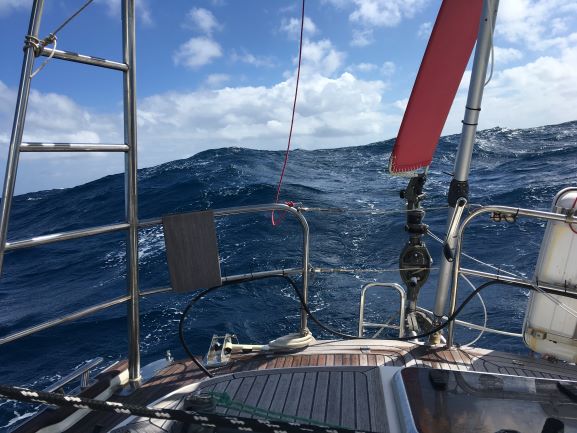 9:30am Making way downwind in 15kt from the W. Some sunshine peeking through the clearing, broken, light cloud overhead, with heavier clouds in the distance. Swell still 3-4m, so continuing with plenty of rolling round ...