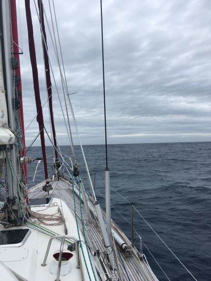Thursday 2:30pm Underway, at last, headed ESE towards 40S in W wind. Expecting wind to back to SW by morning, as Cold Front moves E. Seas still very big but feel so much kindlier when headed downwind.