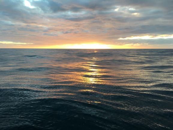 7:30pm Sun is a bright orange ball about to sink down out of sight over the blue sea - a lovely sunset. Lots of birds wheeling around - a flock of prions, storm petrels, great shearwaters - all enjoying the wind and waves and clear blue sky, as we are.