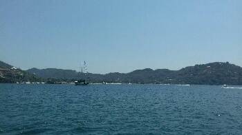 Being Saturday, the beach has been busy and the boats anchored out here have been regularly used as 'marks' for the fast-driven skiboats to round to and from the beach. The long sandy beach is lined with small houses and 'palapas' (outdoor restaurants shaded by a roof of palm fronds on a flimsy, open-sided framework). The land behind rises to high rugged mountains and is mainly jungle-covered or barren.